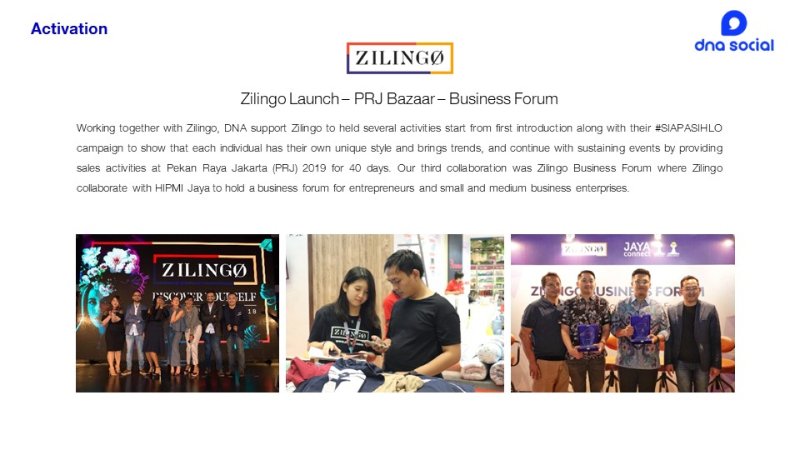 Working together with Zilingo, DNA support Zilingo to held several activites start from first introduction along with #SIAPASIHLO campaign to show that each individual has their own unique style and brings trends, and continue with sustaining events by providing sales activites at Pekan Raya Jakarta (PRJ) 2019 for 40 days.